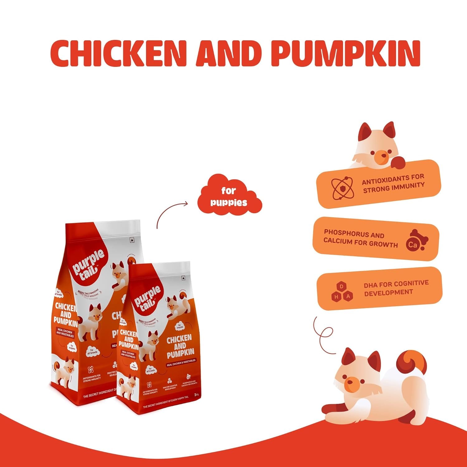 Provide your growing puppy with the balanced nutrition of purple tail puppy food 3kg bhopal. This 3KG pack is ideal for medium-term feeding, featuring a high-protein blend of real chicken and digestive-friendly pumpkin to support your puppy’s critical growth phase.